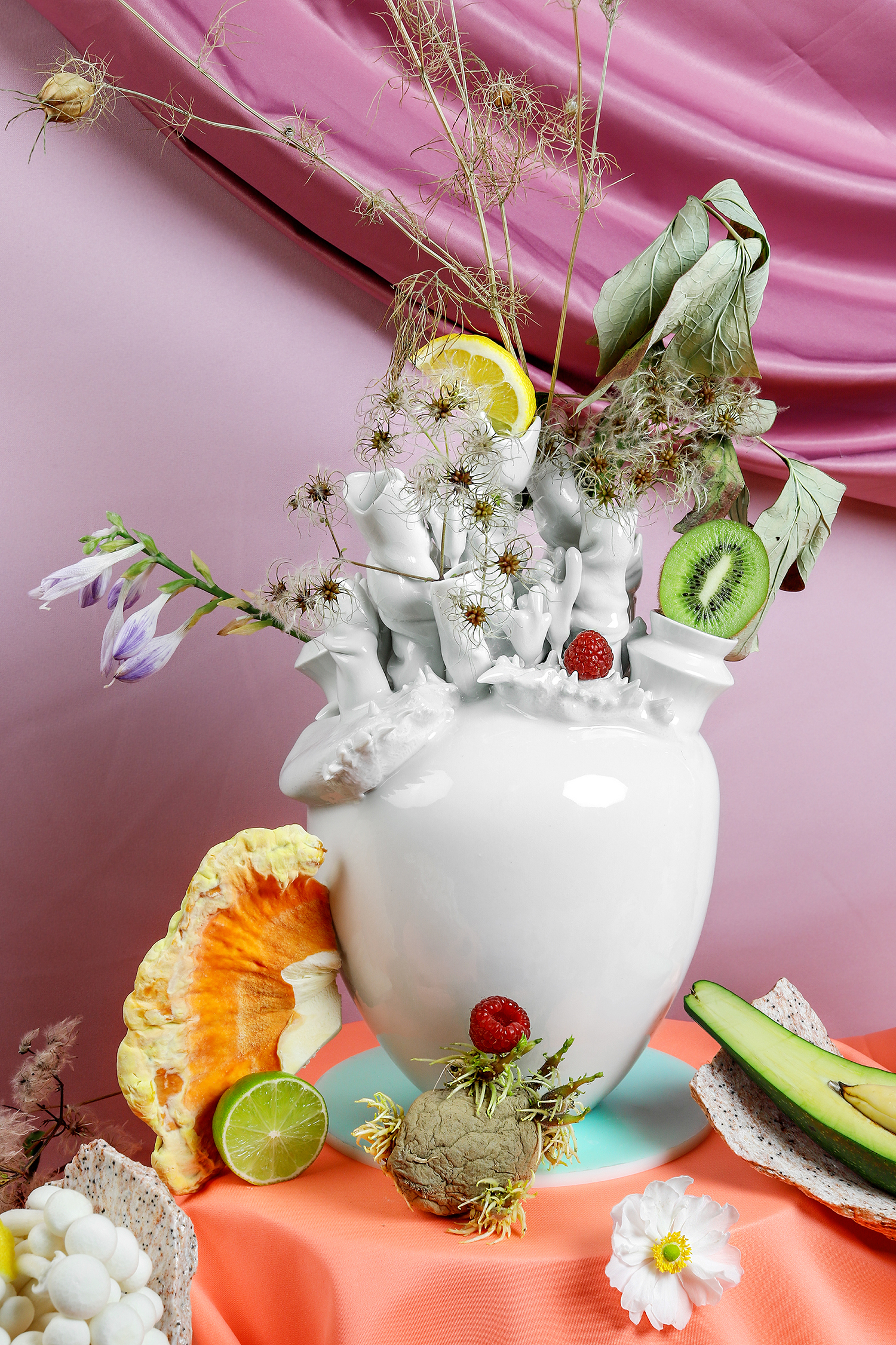 Objekty nás obou se vzájemně prolínají — jdou nad rámec pouhého dialogu. Masy taveného lokálního kamene a subtilní jemnost skrze modelaci porcelánu. Společně tyto kousky vystavujeme žáru, čímž jim dodáváme pohyb.