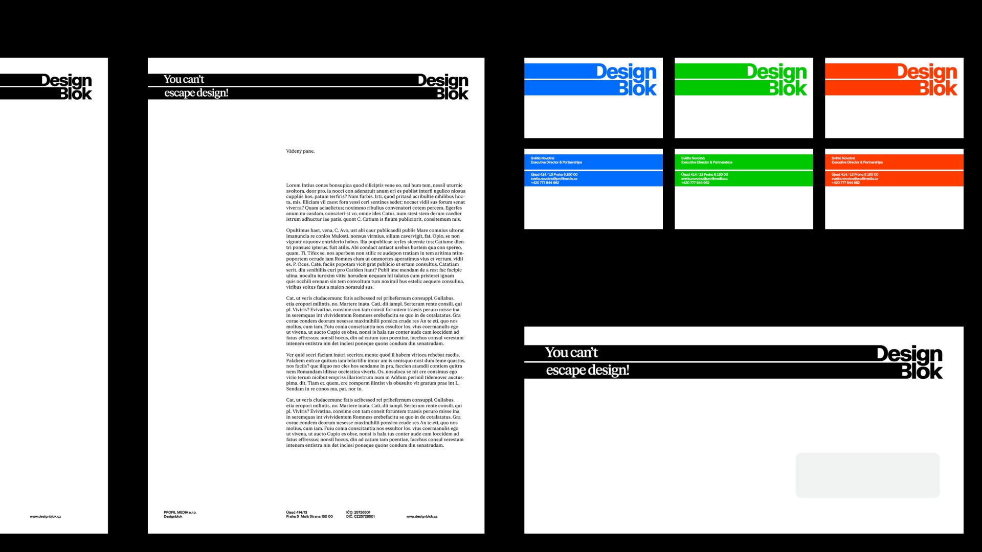Kromě nosných grafických prvků bloku a pruhů používá identita fonty FK Grotesk Neue a FK Roman Standard z dílny české pismolijny Florian Karsten Type Foundry typografa Květoslava Bartoše, nové logo se promítá také do změny psaní slova DesignBlok s velkými písmeny D a B.