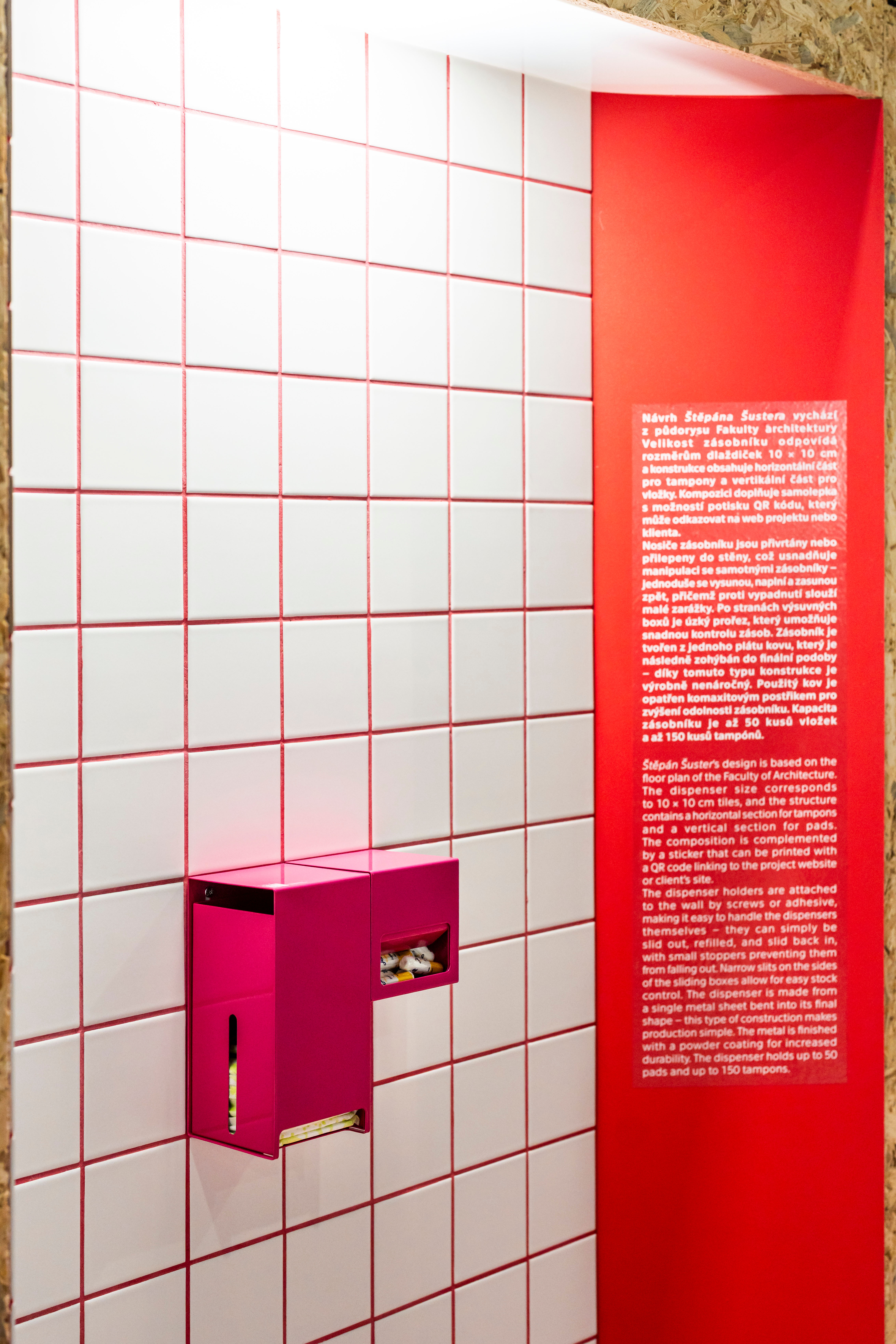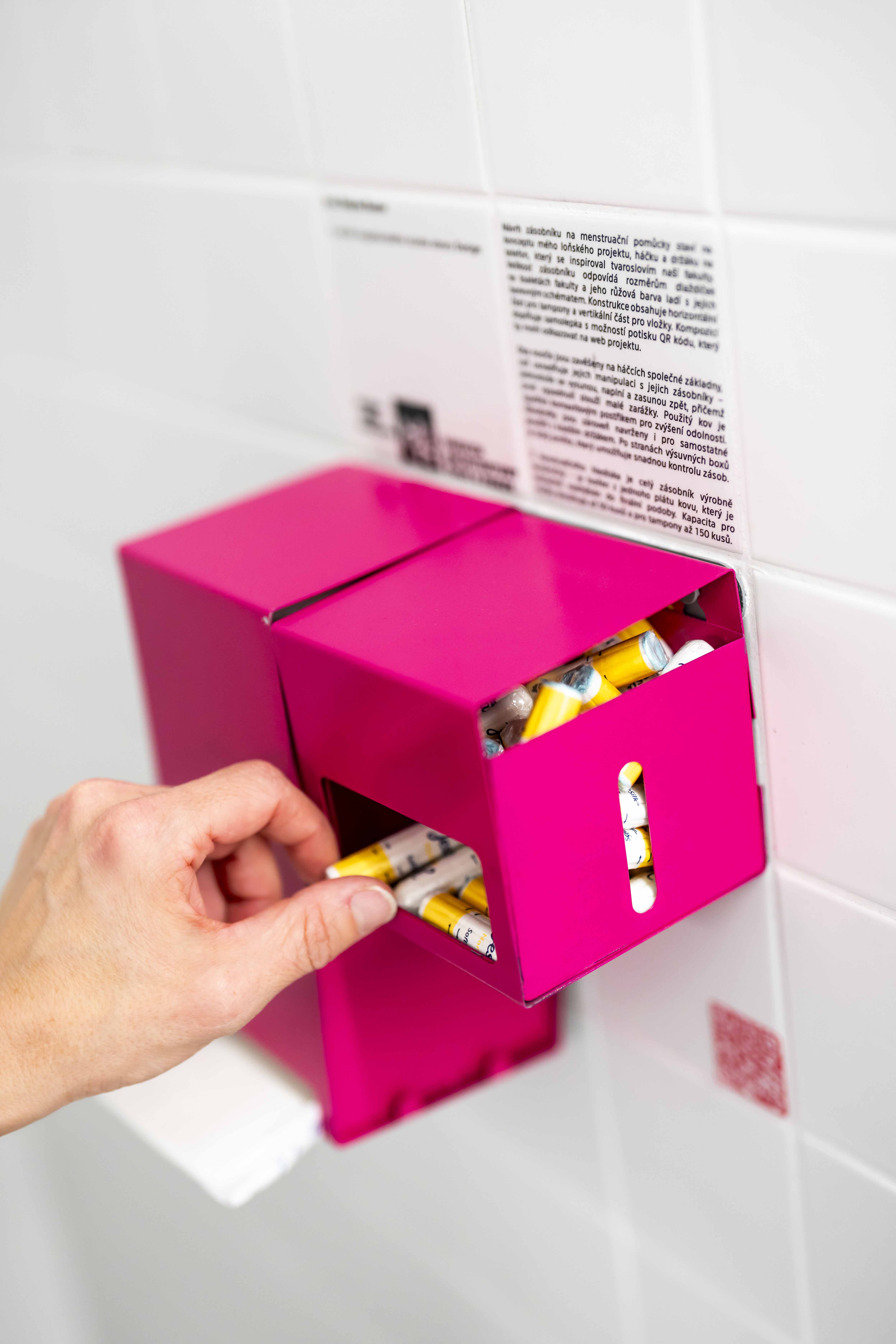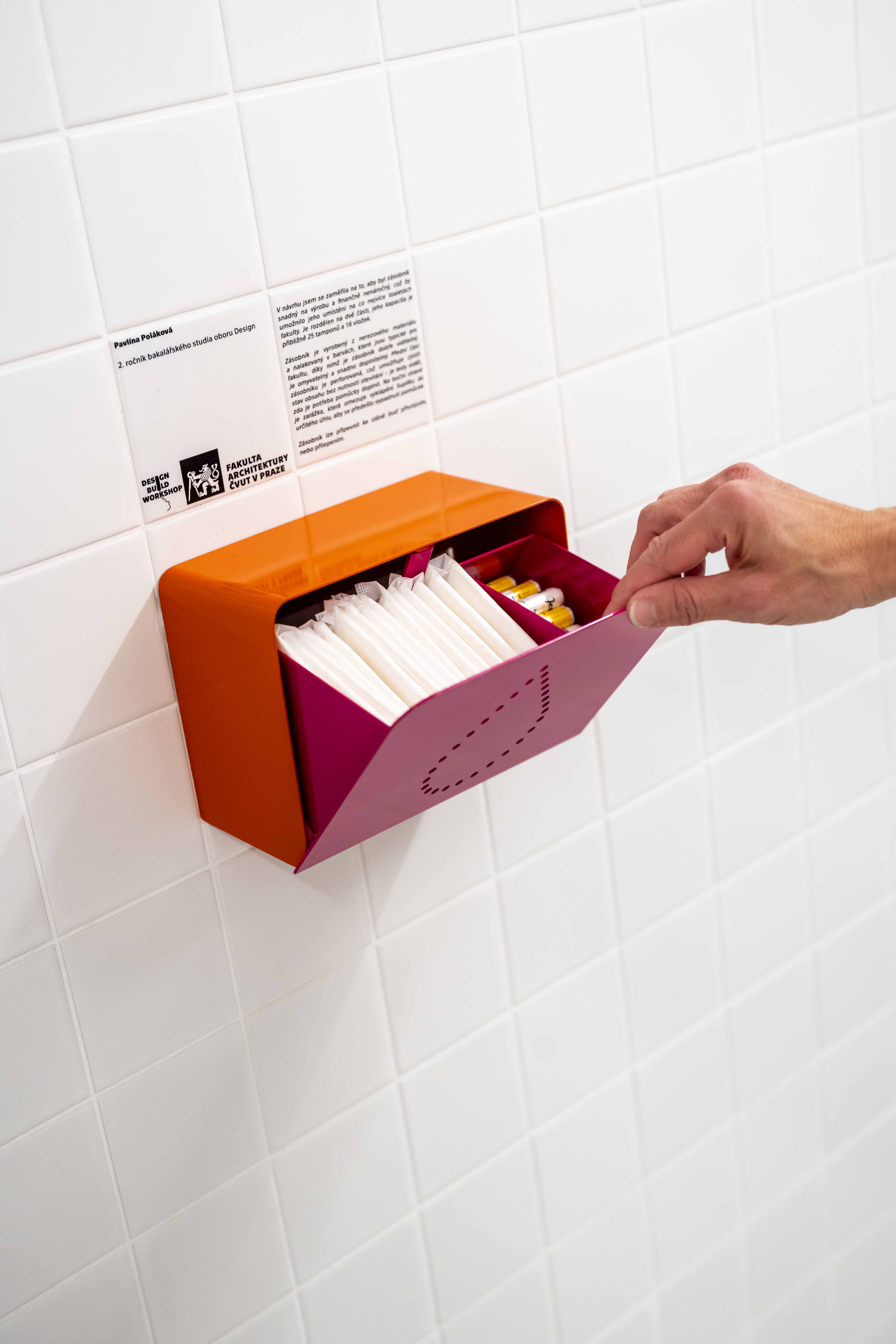 Students of the Design program at the Faculty of Architecture of the Czech Technical University designed three dispensers for menstrual hygiene products as part of a design-build workshop. Their metal creations differ not only in appearance but also in the way pads and tampons are dispensed and where they are placed in restrooms. FA CTU is fighting menstrual poverty and has already produced 55 dispensers for other institutions.